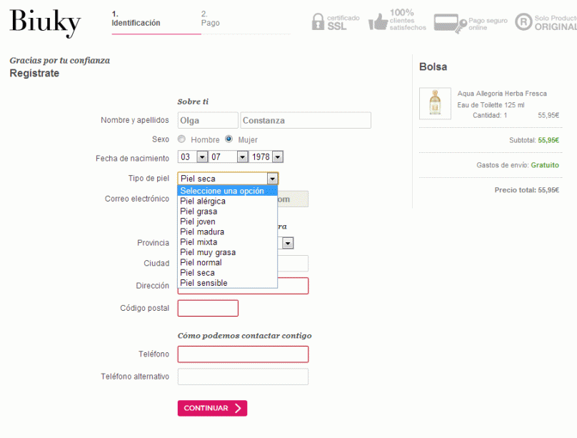 - Tras escoger mis productos y, dispuesta a pagar, me encuentro con el siguiente campo a rellenar junto a mis datos personales: «Tipo de piel».