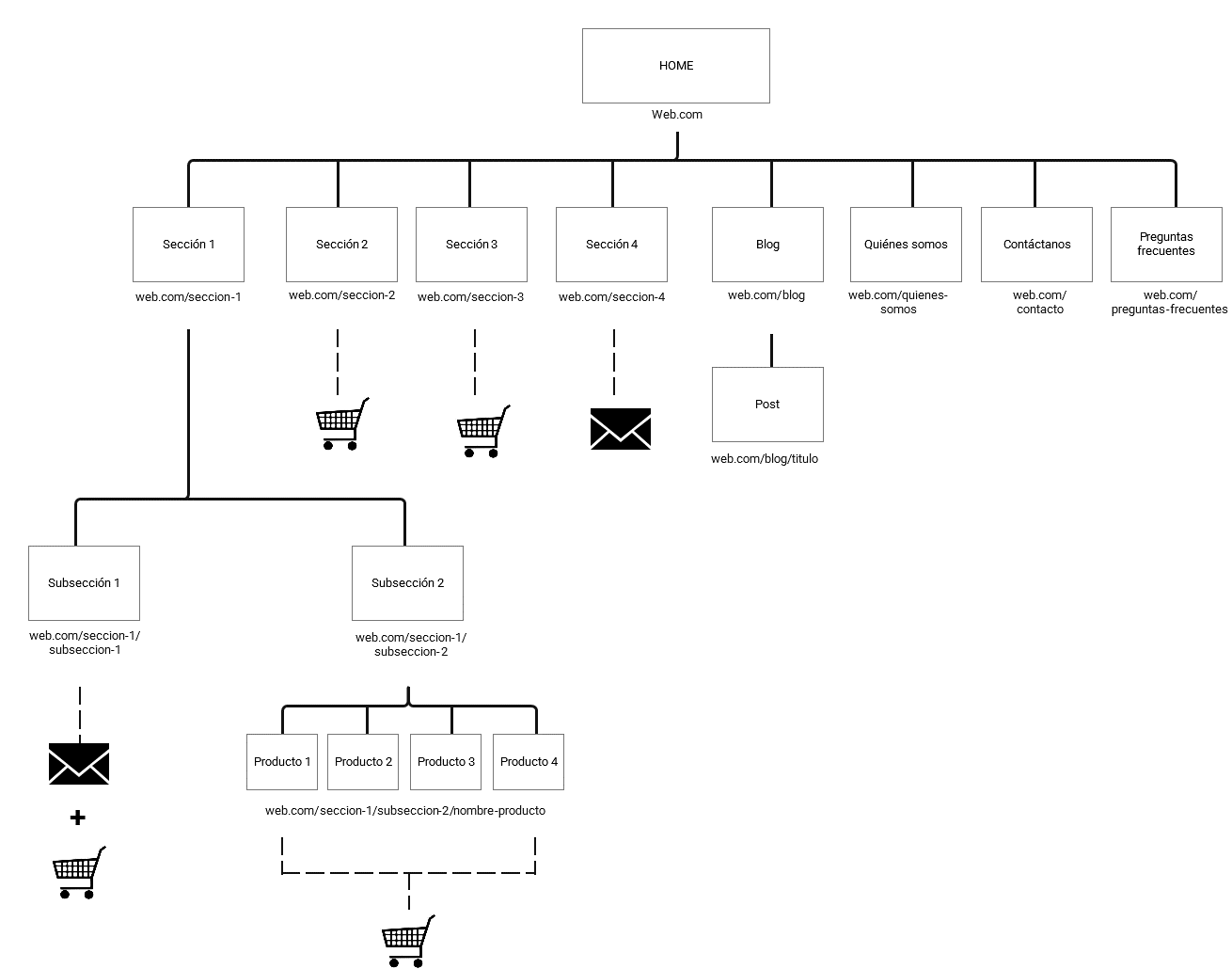 2. Piensa de abajo a arriba: comienza con la pantalla del producto en sí, la página de conversión, y luego piensa en los múltiples caminos para llegar a ella. Por ejemplo, si se tratase de un supermercado online, el producto podría ser un cartón de leche. Desde la página donde adquieres este producto, será más fácil pensar en secciones, home, categorías, etc.